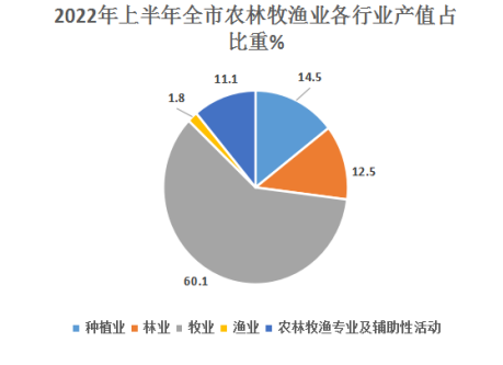 4.從農(nóng)林牧漁各行業(yè)占比重看,畜牧業(yè)占比重最高。2022年上半年,我市種植業(yè)、林業(yè)、畜牧業(yè)、漁業(yè)、農(nóng)林牧漁專業(yè)及輔助性活動(dòng)產(chǎn)值占農(nóng)林牧漁業(yè)總產(chǎn)值的比重分別為14.5%、12.5%、60.1%、1.8%和11.1%,畜牧業(yè)占比重最高。