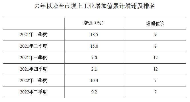 2022年1-6月,我市規(guī)上工業(yè)增加值同比增長9.2%,較一季度下降1.1個百分點,高于全省平均5.7個百分點,居第七位。