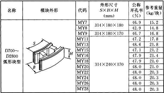 注:“MY 16”,其中“MY”表示弧形模塊,“16”表示模塊的內(nèi)弧直徑為1600mm。