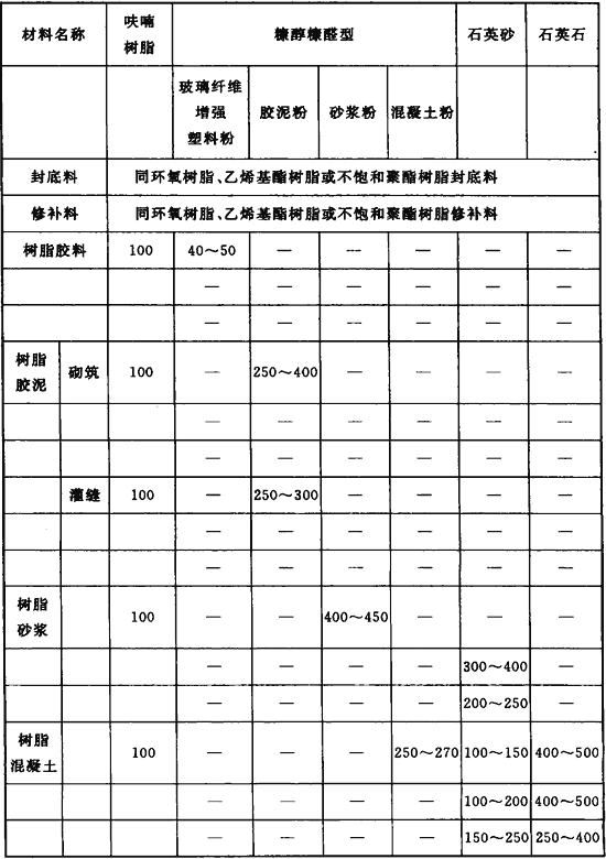 表B.0.3 呋喃樹(shù)脂類(lèi)材料的施工配合比(質(zhì)量比)