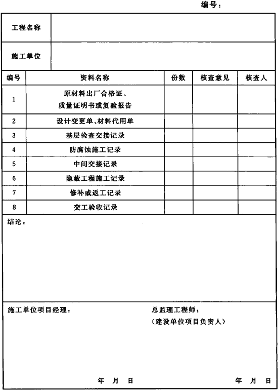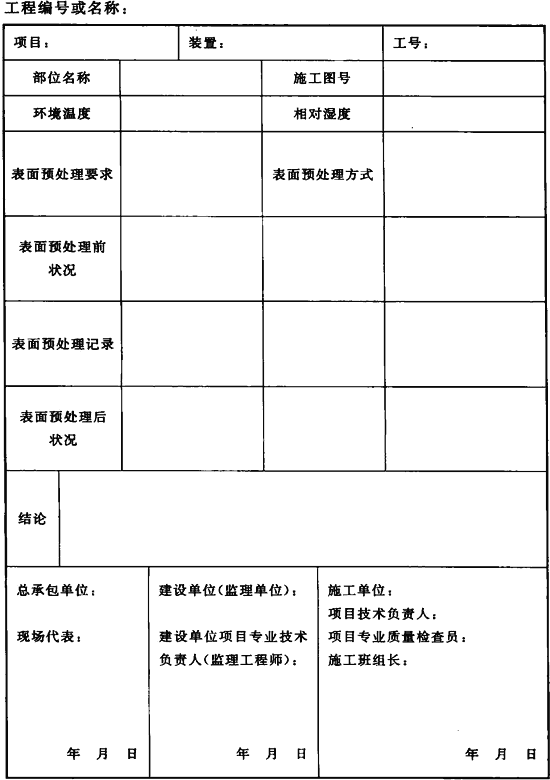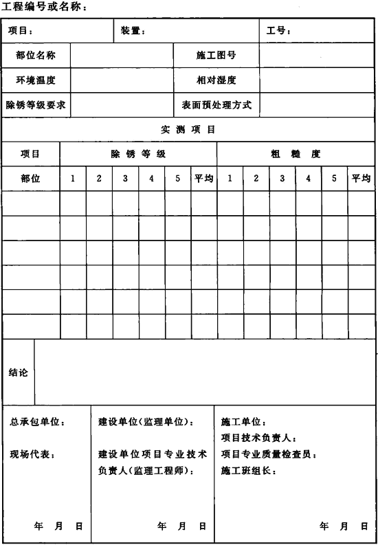 15.0.5 建筑防腐蝕工程施工的基層表面預(yù)處理、隱蔽工程檢查、工程中間交接和交工驗(yàn)收交接記錄可按表15.0.5-1~表15.0.5-4填寫(xiě);防腐蝕工程交工驗(yàn)收資料交接匯總可按表15.0.5-5填寫(xiě)。