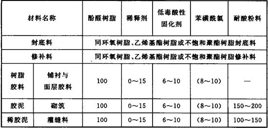 5 環(huán)氧樹(shù)脂玻璃鱗片膠泥和環(huán)氧樹(shù)脂自流平料與固化劑的配合比由供貨商提供或經(jīng)試驗(yàn)確定。