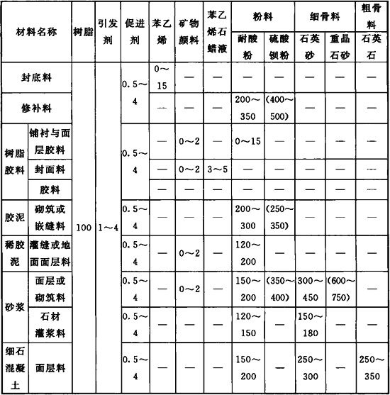 表B.0.2 乙烯基酯樹(shù)脂和不飽和聚酯樹(shù)脂材料的施工配合比(質(zhì)量比)