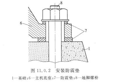 11.0.2調(diào)平圖11.0.1所示的B平面前,應(yīng)在主機(jī)底座下面與基礎(chǔ)接觸處和地腳螺栓接觸處墊上橡膠防震墊或減震器(圖11.0.2),調(diào)平后應(yīng)緊固螺栓。