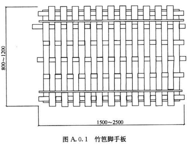 A.0.2 竹串片腳手板應采用螺栓穿過并列的竹片擰緊而成,螺栓直徑應為8mm~10mm,間距應為500mm~600mm,螺栓孔直徑不得大于10mm。板的厚度不得小于50mm,寬度應為250mm~300mm,長度應為2m~3.5m(圖A.0.2)。
