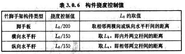 3.0.6 竹腳手架構(gòu)件的撓度控制值應符合表3.0.6的規(guī)定。