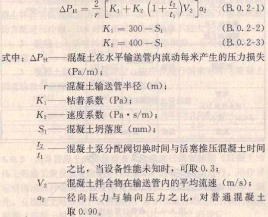 B.0.2 混凝土在水平輸送管內(nèi)流動(dòng)每米產(chǎn)生的壓力損失宜按下列公式計(jì)算,采用其他方法確定壓力損失時(shí),宜通過(guò)試驗(yàn)驗(yàn)證。