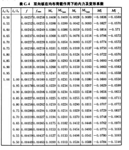 C.4 雙向板在均布荷載作用下的內(nèi)力及變形系數(shù)(免費下載)JGJ 162-2008 建筑施工模板安全技術(shù)規(guī)范
