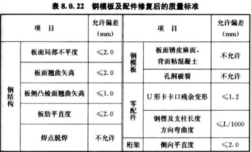 5.鋼模板及配件等修復(fù)后,應(yīng)進行檢查驗收。凡檢查不合格者應(yīng)重新整修。待合格后方準(zhǔn)應(yīng)用,其修復(fù)后的質(zhì)量標(biāo)準(zhǔn)應(yīng)符合表 8.0.22的規(guī)定。(免費下載)JGJ 162-2008 建筑施工模板安全技術(shù)規(guī)范