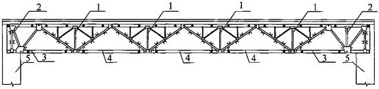 1-三角構(gòu)件;2-端構(gòu)件;3-端弦桿;4-弦桿;5-支座結(jié)構(gòu)