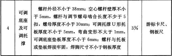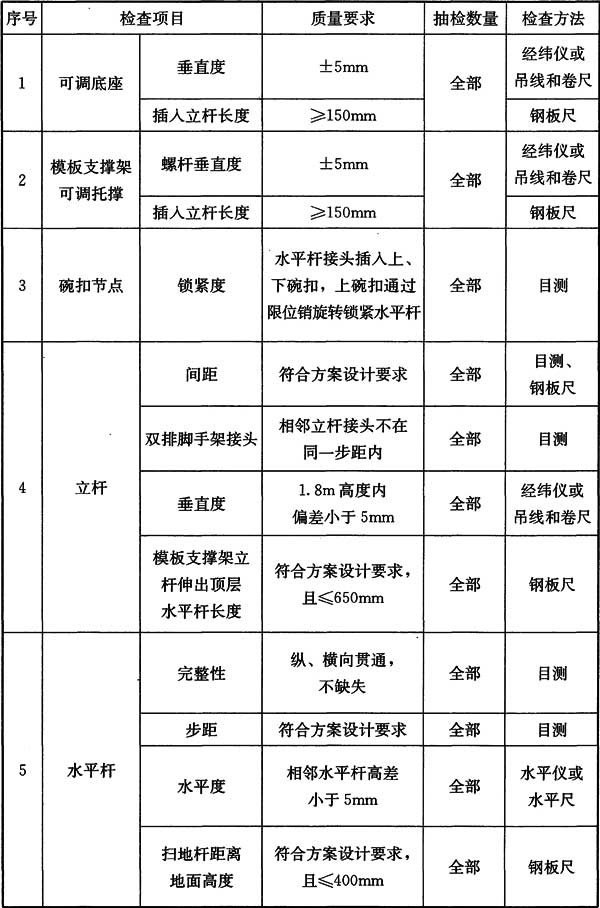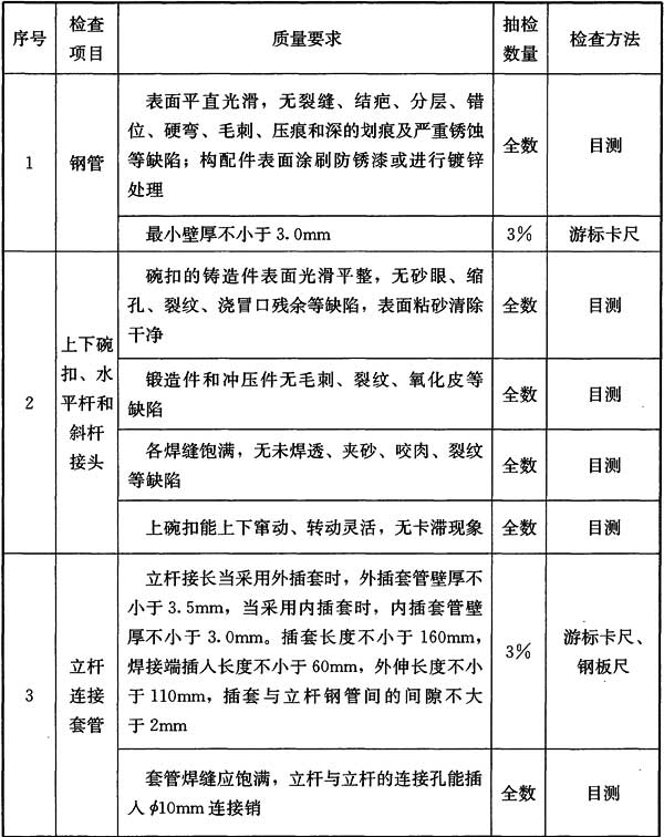 8.0.4 架體檢查驗收項目、質(zhì)量要求、抽檢數(shù)量、檢驗方法應(yīng)符合本規(guī)范附錄表D-3的規(guī)定,并應(yīng)重點(diǎn)檢查和驗收下列內(nèi)容: