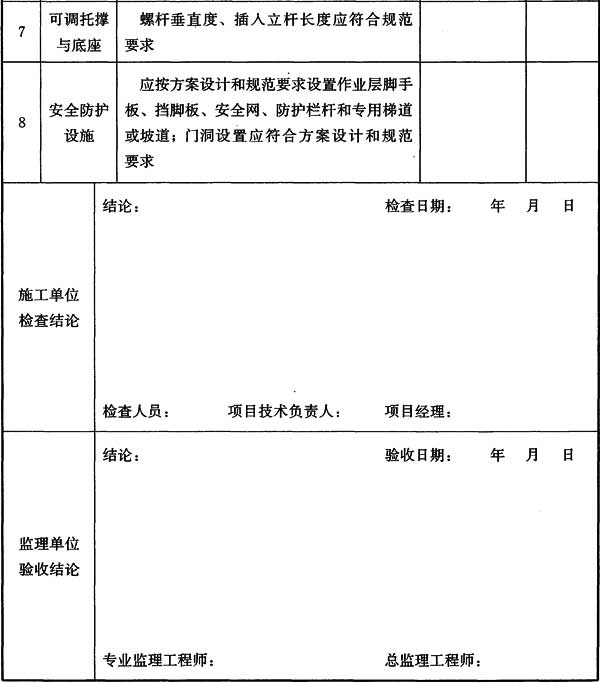 8.0.7 腳手架搭設(shè)至設(shè)計高度后,在投入使用前,應(yīng)在階段檢查驗收的基礎(chǔ)上形成完工驗收記錄,記錄表應(yīng)符合本規(guī)范附錄E的規(guī)定。