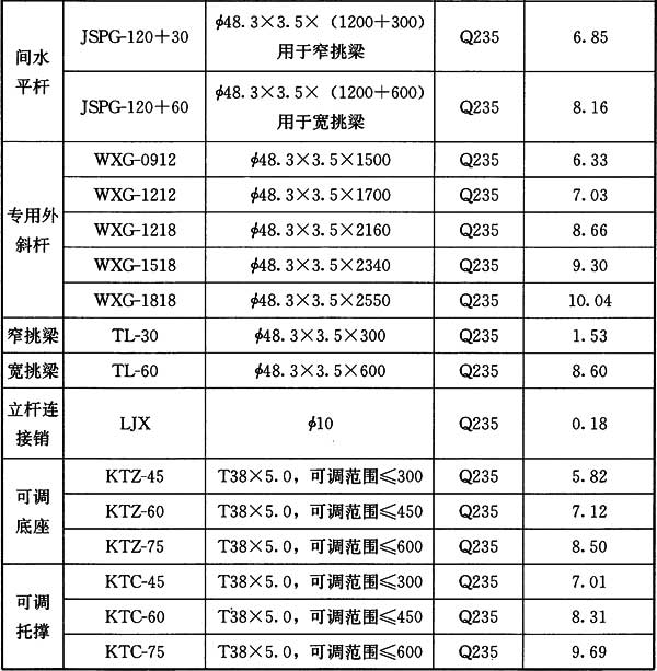 注:表中所列立桿型號標(biāo)識為“-A”代表節(jié)點(diǎn)間距按0.6m模數(shù)(Q235材質(zhì)立桿)設(shè)置;標(biāo)識為“-B”代表節(jié)點(diǎn)間距按0.5m模數(shù)(Q345材質(zhì)立桿)設(shè)置。