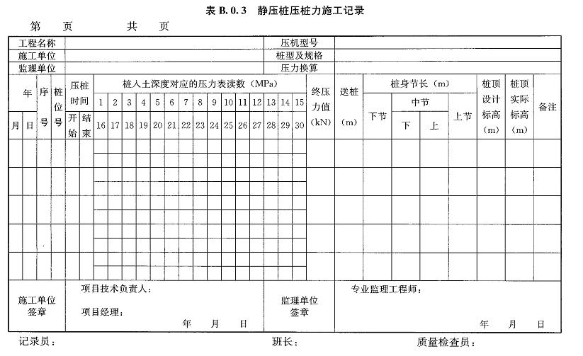 B.0.3試壓樁及工程樁總數(shù)的10%樁以及地層有變化區(qū)域的工程樁,必須詳細(xì)記錄每米的壓樁力,施工記錄應(yīng)符合表B.0.3的規(guī)定。