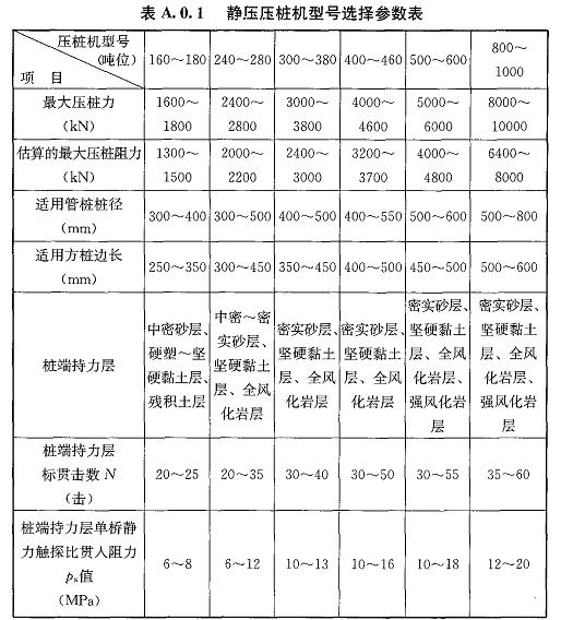 A.0.1靜壓壓樁機(jī)應(yīng)根據(jù)最大壓樁阻力、樁的截面尺寸、單樁豎向極限承載力、樁端持力層土層情況、穿越土層情況等條件選擇,可按表A.0.1進(jìn)行。
