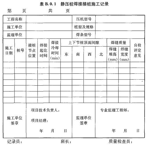B.0.1靜壓樁焊接接樁施工記錄應(yīng)符合表B.0.1的規(guī)定。