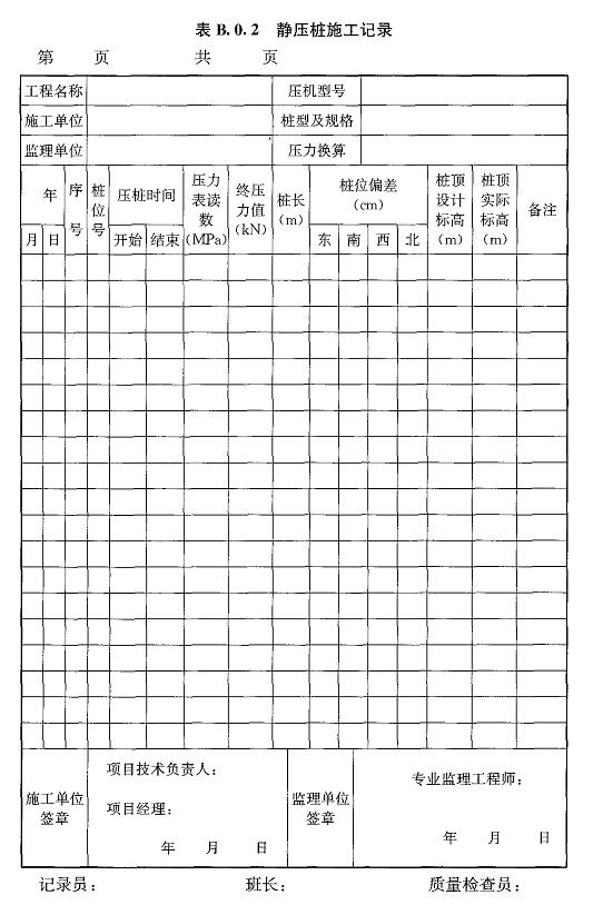B.0.2靜壓樁施工記錄應(yīng)符合表B.0.2的規(guī)定,其中樁位偏差為送樁前測(cè)量。