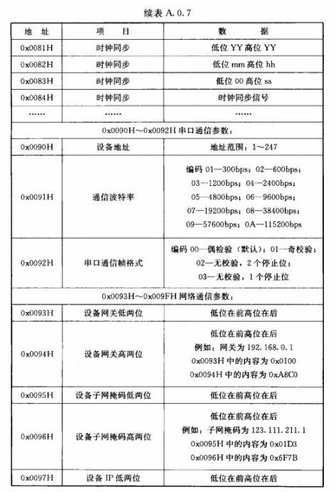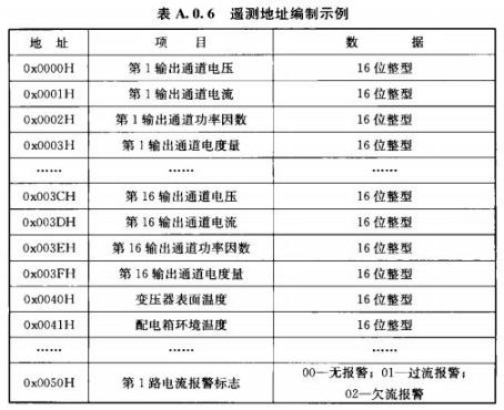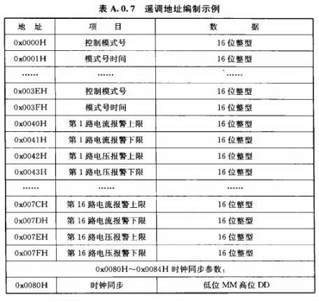 A.0.7遙調(diào)應(yīng)采用功能碼0x03(讀)、0x06(寫單個)、0x10(寫多個)。數(shù)據(jù)區(qū)地址應(yīng)按表A.0.7示例編址。