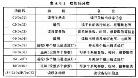 A.0.2城市照明自動控制系統(tǒng)應(yīng)按表A.0.2規(guī)定9種功能碼進行定義,超出的可自定義擴展,并應(yīng)在驗收文件中予以說明。