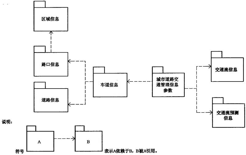 本標(biāo)準(zhǔn)采用統(tǒng)一建模語言(UML)描述城市道路交通管理中信息參數(shù)存儲的總體結(jié)構(gòu),包括信息參數(shù)的數(shù)據(jù)子集、數(shù)據(jù)實體和數(shù)據(jù)元素之間的關(guān)系。UML中的包表示數(shù)據(jù)子集,類表示數(shù)據(jù)實體,屬性表示數(shù)據(jù)元素。