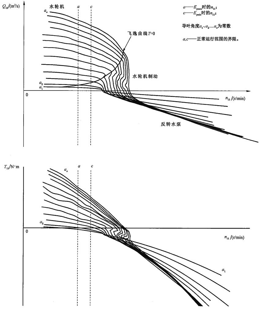 水輪機(jī)的水力性能的全面描述用圖2中象限1和象限4表示,除進(jìn)行常規(guī)水力性能試驗(yàn)和飛逸試驗(yàn)外,還應(yīng)進(jìn)行水輪機(jī)制動(dòng)、零流量和反轉(zhuǎn)水泵試驗(yàn)。