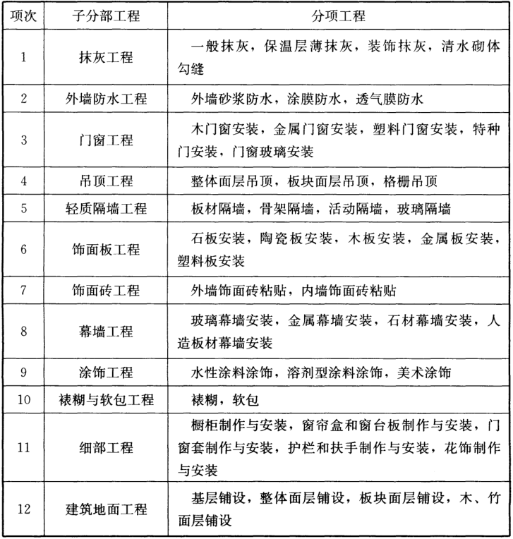 表A 建筑裝飾裝修工程的子分部工程、分項(xiàng)工程劃分