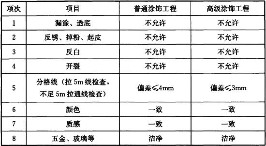 8.0.5 合成樹脂乳液內(nèi)墻涂飾材料的涂飾工程按質(zhì)量應(yīng)分為普通涂飾工程和高級涂飾工程,并應(yīng)符合表8.0.5規(guī)定。