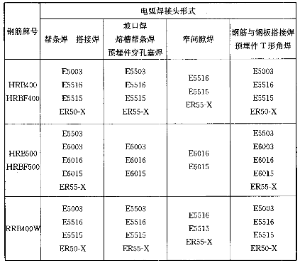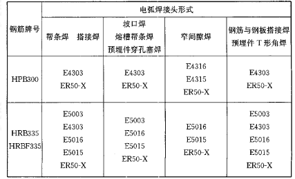 3.0.3 鋼筋焊條電弧焊所采用的焊條。應(yīng)符合現(xiàn)行國家標(biāo)準《碳鋼焊條 GB/T 5117或《低臺金鋼焊條》GB/T 5118的規(guī)定。鋼筋二氧化碳氣體保護電弧焊所采用的焊絲,應(yīng)符合現(xiàn)行國家標(biāo)準《氣體保護電弧焊用碳鋼、低合金鋼焊絲))GB/T 8110的規(guī)定。其焊條型號和焊絲型號應(yīng)根據(jù)設(shè)計確定;若設(shè)計無規(guī)定時,可按表3.0.3選用。