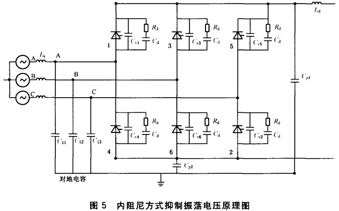 在三相橋式電路中,一般采用內(nèi)阻尼或外阻尼方式對振蕩電壓進(jìn)行抑制,同時還應(yīng)充分考慮阻尼回路的功率損耗。在直流輸電系統(tǒng)中,一般采用內(nèi)阻尼方式,見圖5。