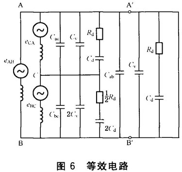 圖5給出了考慮電路漏感和設(shè)備雜散電容時的內(nèi)阻尼電路。導(dǎo)致電壓振蕩的電感有系統(tǒng)等值電感、變壓器漏感和引線電感。其中,引線電感很小,可忽略不計(jì)。變壓器漏感總是起主要作用。系統(tǒng)等值電感在變壓器第三繞組沒有諧波濾波器時,不能忽略,但當(dāng)接有濾波器時,則可忽略,只考慮變壓器漏感Lk。圖5中,C1n(C11、C12、C13)包括變壓器二次繞組對鐵心和箱殼的電容、變壓器套管對地電容、從變壓器到閥體引線對地電容、穿墻套管對地電容等;每個閥電容Cv包括閥體本身的雜散電容及接入閥體中的電容;每個極對地電容Cp包括由閥到平波電抗器Ld引線或電纜上的對地電容、套管對地電容,以及接在極上的各種設(shè)備的對地電容,如直流電壓互感器、直流電流互感器等的對地電容。