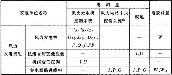 注:①風(fēng)力發(fā)電機(jī)自身的電氣參數(shù)測(cè)量由風(fēng)力發(fā)電機(jī)控制系統(tǒng)完成,能將風(fēng)力發(fā)電機(jī)的電氣參數(shù)經(jīng)通信方式上傳至風(fēng)力電站中央監(jiān)控系統(tǒng)。