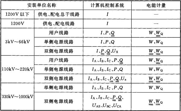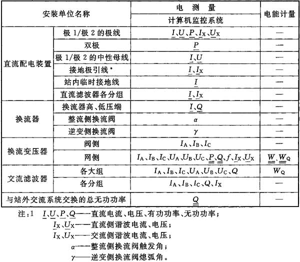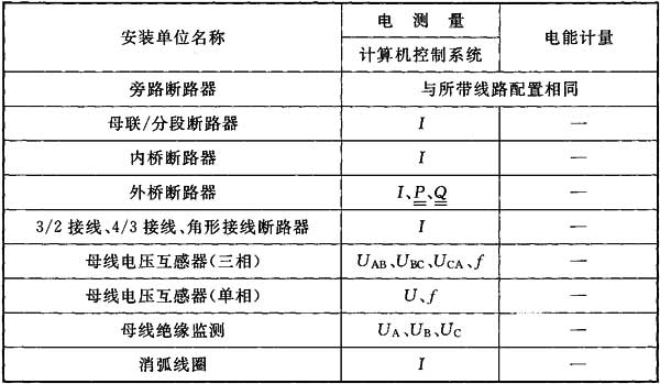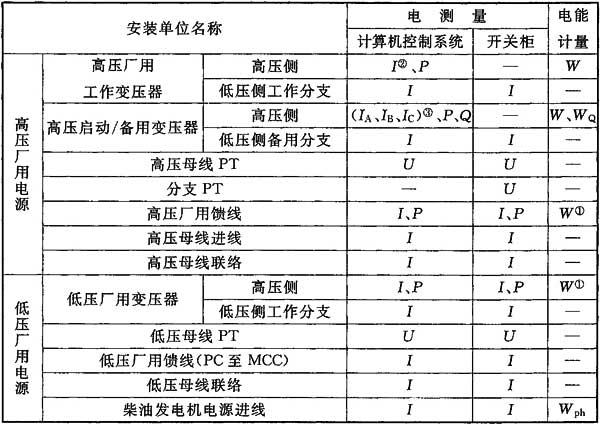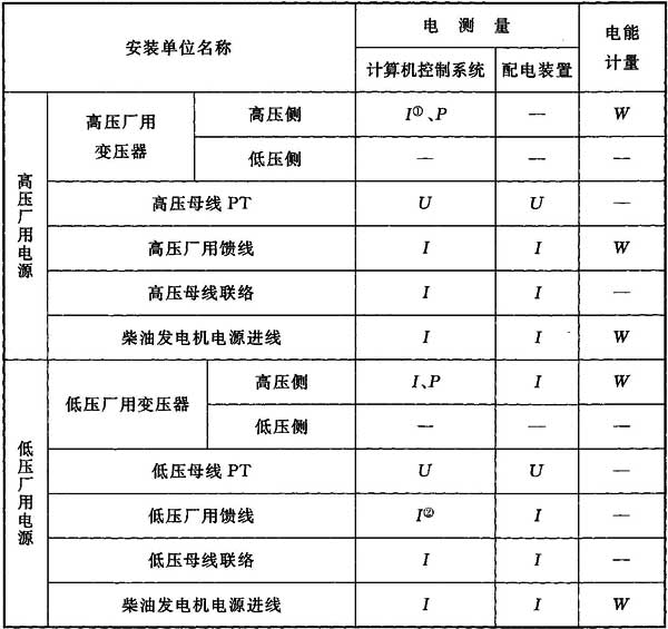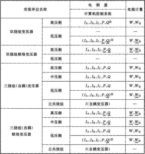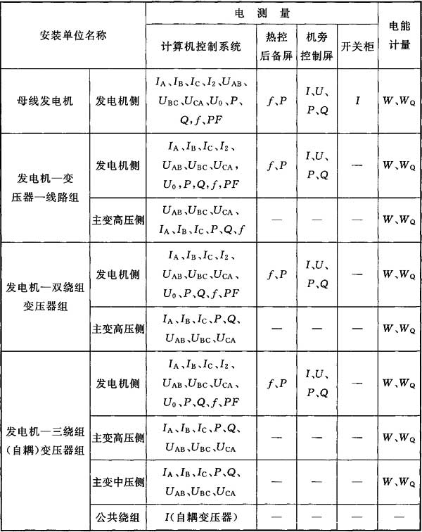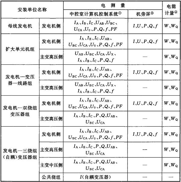 注:①本表中計(jì)算機(jī)監(jiān)控系統(tǒng)采集的電測(cè)量參數(shù)為各就地控制單元上配置的電氣測(cè)量?jī)x表采集傳送的電量數(shù)據(jù),電氣測(cè)量?jī)x表應(yīng)包括綜合交流采樣電量綜合測(cè)量?jī)x表、電量變送器等。