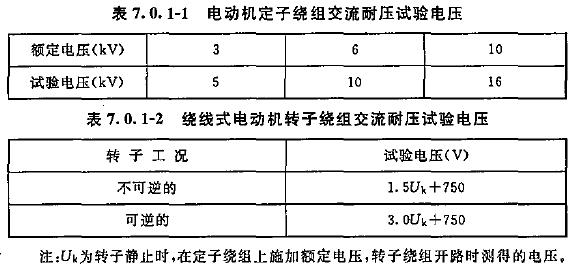 2) 主回路及電氣設(shè)備的交流耐壓試驗(yàn),應(yīng)符合現(xiàn)行國(guó)家標(biāo)準(zhǔn)《電氣裝置安裝工程電氣設(shè)備交接試驗(yàn)標(biāo)準(zhǔn)》GB 50150的有關(guān)規(guī)定或產(chǎn)品技術(shù)文件要求;其中電動(dòng)機(jī)的交流耐壓試驗(yàn)應(yīng)符合表7.0.1-1和表7.0.1-2的規(guī)定。