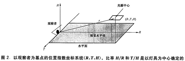 位置指數(shù)p通過(guò)對(duì)表1的數(shù)據(jù)進(jìn)行插值獲得。圖2中給出了表中參數(shù)的定義。這些參數(shù)是T/R和H/R,其中(R,T,H)來(lái)自于以觀察者為基點(diǎn)建立的坐標(biāo)系統(tǒng)。假定視線是水平的,R是投影到視線上的距離,T是相對(duì)視線的水平偏移量,而H是觀察者眼睛上方的高度。所有的坐標(biāo)都是以燈具為中心的。