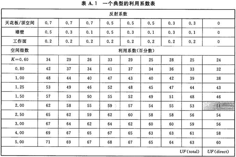UGR表格類似于已被熟知的“利用系數(shù)表”,“利用系數(shù)”通過(guò)“房間指數(shù)(或者房間空間比率)”將燈具光強(qiáng)分布、房間表面反射和房間等效尺寸考慮在內(nèi)。燈具制造商提供一個(gè)對(duì)于標(biāo)準(zhǔn)反射范圍和房間指數(shù)的利用系數(shù)。在計(jì)算中用到的基準(zhǔn)值需要有修正系數(shù)(如:鎮(zhèn)流器因數(shù))才能獲得對(duì)應(yīng)導(dǎo)出照度的真實(shí)值。表A.1是一個(gè)典型的利用系數(shù)表。設(shè)計(jì)者選擇了一個(gè)光源(根據(jù)實(shí)際光通)、房間表面反射率并計(jì)算了房間指數(shù)。如果實(shí)際值與提供表格內(nèi)的標(biāo)準(zhǔn)值不同可以采用插值處理。