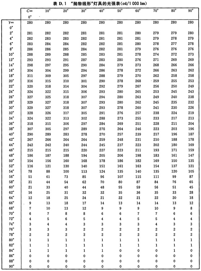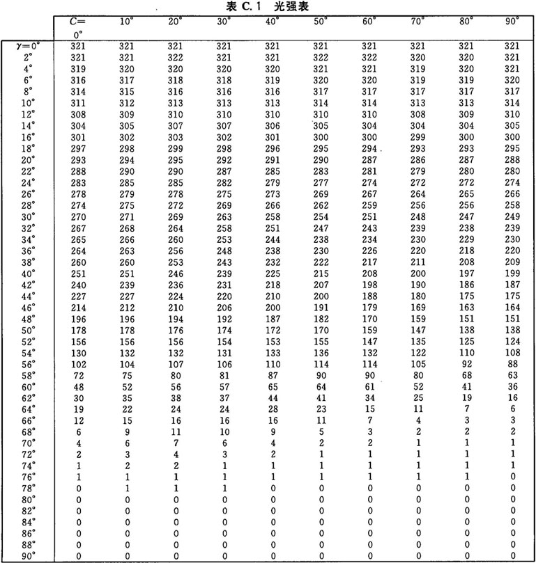 表C.1光強(qiáng)表。數(shù)據(jù)單位是cd/1000lm。因?yàn)闊艟呤请p面對(duì)稱的,所以實(shí)際表格范圍中C=0°~90°;因?yàn)棣茫?0°~180°的光強(qiáng)是零,所以實(shí)際表格范圍中γ=0°~90°。