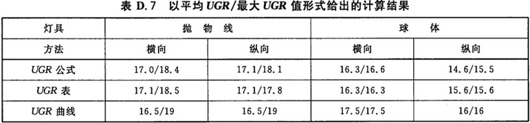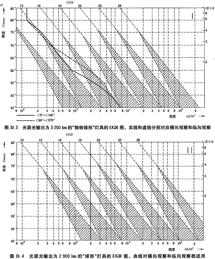 從圖D.3的“拋物線形”燈具的UGR圖中可以看出,平均UGR約為16.5,而當(dāng)亮度跡線接觸到此UGR曲線的陰影區(qū)時(shí),UGR取最大值,比平均UGR大一些,約為19。表D.7注明了兩個(gè)方向的UGR值。