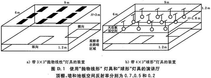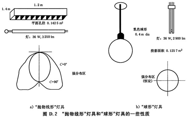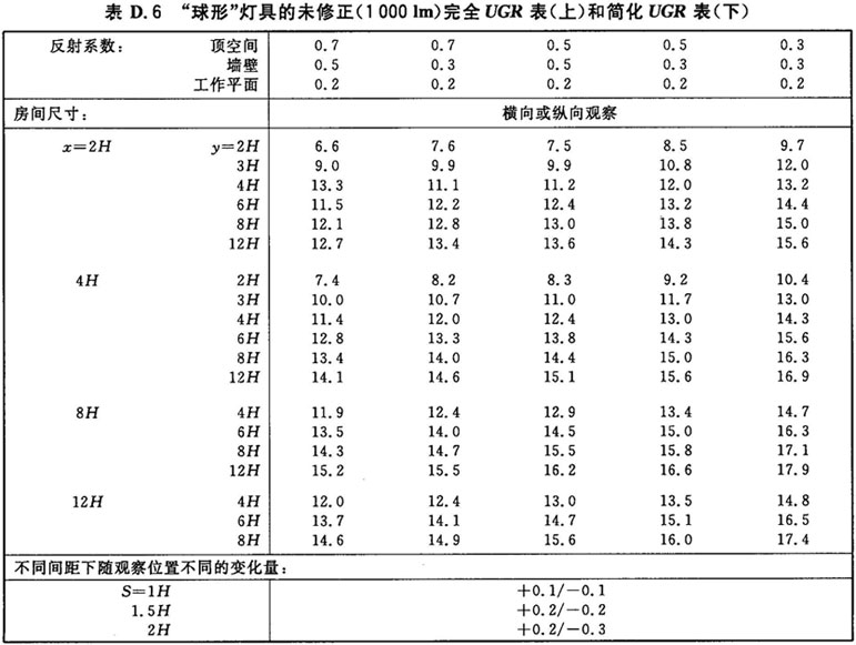 對(duì)于“球形”燈具,見圖D.4,兩個(gè)觀察方向上的相應(yīng)房間尺寸是3.33H和5H。分別對(duì)應(yīng)橫向觀察和縱向觀察的UGR值大約為17.5和16。這些數(shù)據(jù)也在表D.7中注明了。