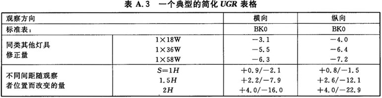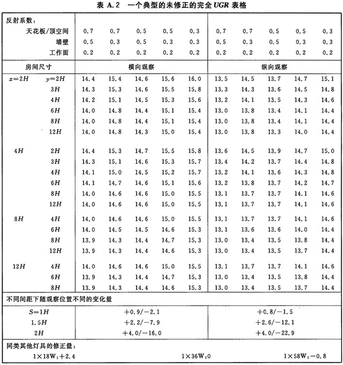 表A.2是未經(jīng)修正的,例如:它是按照每個(gè)燈具1000lm的基準(zhǔn)值進(jìn)行計(jì)算的。該表使用了一個(gè)標(biāo)準(zhǔn)的房間墻面反射率系列。它的分析允許房間達(dá)到12H×12H(H代表高于眼睛的安裝高度,基準(zhǔn)值是2m)。附屬表給出了UGR是如何根據(jù)觀察者的位置在三個(gè)燈具間的不同而變化的。也列出了其他類似燈具的修正因數(shù)。所有的因數(shù)都是相加的,因?yàn)閁GR是對(duì)數(shù)函數(shù)。