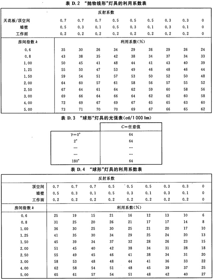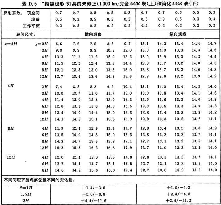 表D.5是“拋物線形”燈具的UGR表格,用于完成表A.6和表A.7中的表格。下面的內(nèi)容描述了計(jì)算過(guò)程。