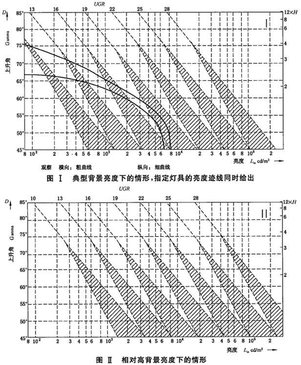 兩個(gè)燈具的UGR圖分別是“拋物線形”燈具為類型Ⅰ,“球形”燈具為類型Ⅱ。(見圖D.3和圖D.4)。