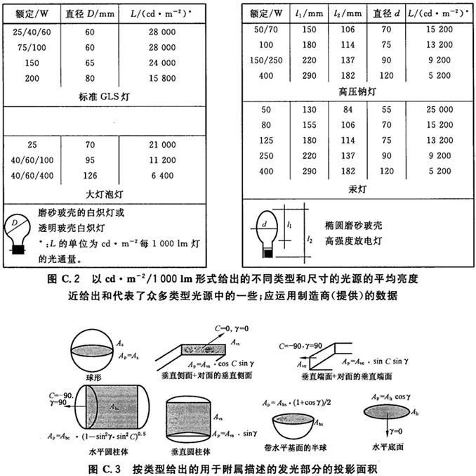 A類(見表C.2)針對(duì)具有恒定或近乎恒定亮度L的燈具。這種燈具可能包括裸燈或者使用了鏡面型反射器可以看到裸燈像的燈具。困難在于選擇恰當(dāng)?shù)牧炼戎?。裸燈的平均光通?shù)據(jù)表很有用(見圖C.2)。對(duì)于使用了裸燈的燈具此值可以直接應(yīng)用。對(duì)于使用了鏡面型反射器的燈具,此數(shù)據(jù)應(yīng)該通過(guò)乘上反射材料的反射率來(lái)降低數(shù)值。