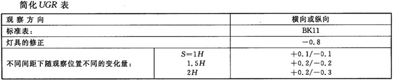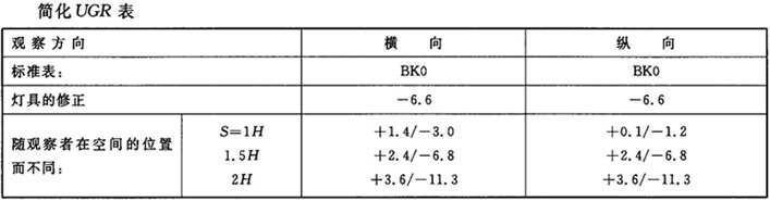 對(duì)于簡(jiǎn)化UGR表,從標(biāo)準(zhǔn)表BK11中選擇值15.0和14.3。加上燈具修正(-0.8)和背景亮度修正(LR=6×0.40-5×0.16=1.6),所以修正[見式(A.6)=-8log1.6=-1.6],結(jié)果是12.6和11.9。這些值與從完全UGR表中得出的值相近。