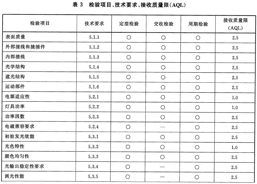 各類檢驗包含的檢驗項目、技術(shù)要求、接收質(zhì)量限(AQL)見表3。(免費下載)GB/T 32486-2016 舞臺LED燈具通用技術(shù)要求