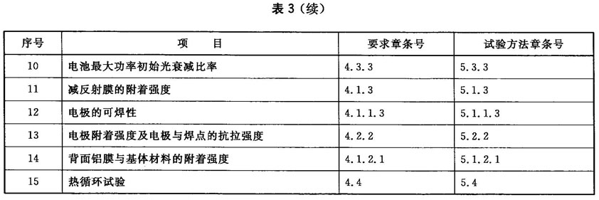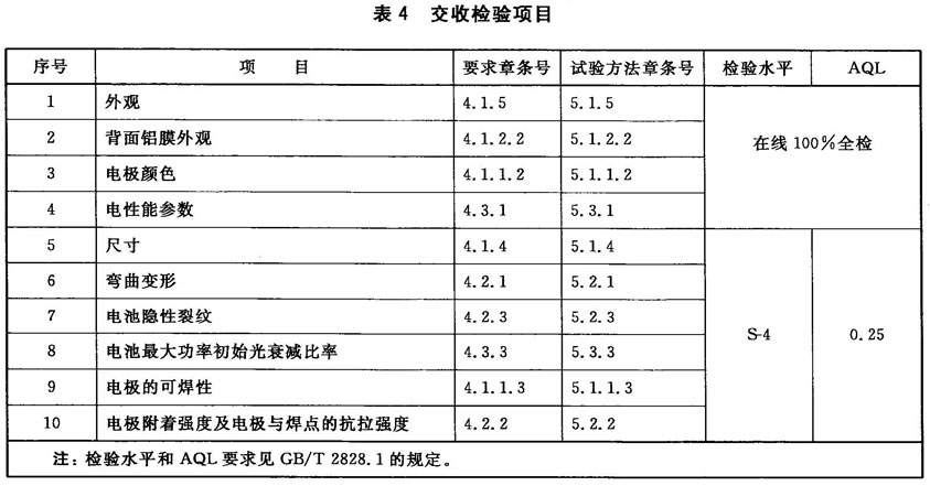 一個(gè)交收檢驗(yàn)批可由一個(gè)生產(chǎn)批組成或由采用基本相同的材料、工藝和設(shè)備,間隔時(shí)間不超過一周的幾個(gè)生產(chǎn)批組成。交收檢驗(yàn)項(xiàng)目除全檢項(xiàng)目外,其他項(xiàng)目抽樣方案按GB/T 2828.1-2003中的規(guī)定進(jìn)行,其檢測(cè)項(xiàng)目、抽樣方案,檢驗(yàn)水平、接收質(zhì)量限(AQL)按照表4規(guī)定進(jìn)行。對(duì)于在線全檢項(xiàng)目,如電池達(dá)不到任意一項(xiàng)要求,則該片電池應(yīng)被判定為不合格品。