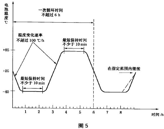 將經(jīng)初始光衰減穩(wěn)定后的電池樣品間隔地放置在環(huán)境試驗(yàn)箱(相對(duì)濕度小于60%)中,按照?qǐng)D5的溫度分布,使電池的溫度在-40℃±2℃和85℃±2℃之間循環(huán)。在兩個(gè)極端溫度的保持時(shí)間不少于10min,一次循環(huán)時(shí)間不超過6h,循環(huán)次數(shù)5次。再按5.1.5、5.2、5.3.1的規(guī)定對(duì)電池的外觀、力學(xué)性能和電性能參數(shù)中的最大功率進(jìn)行檢測(cè)。