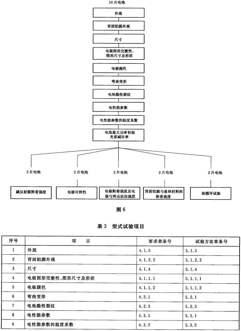 一個(gè)型式試驗(yàn)批由采用同一材料、同一結(jié)構(gòu)設(shè)計(jì)、同一工藝條件、基本相同的生產(chǎn)設(shè)備在不超過三天的時(shí)間內(nèi)所生產(chǎn)的電池組成。型式試驗(yàn)時(shí),按GB/T 2829規(guī)定的方法從同一批樣品中隨機(jī)抽取10片樣品,按圖6所示的程序進(jìn)行全項(xiàng)目檢測(cè)。檢測(cè)項(xiàng)目、試驗(yàn)方法及要求見表3規(guī)定,各項(xiàng)檢測(cè)結(jié)果應(yīng)符合對(duì)應(yīng)要求條款的規(guī)定。如任意一片樣品的任一項(xiàng)目不符合要求,則該設(shè)計(jì)被判定達(dá)不到定型要求,應(yīng)查明原因,進(jìn)行改進(jìn)后,重新進(jìn)行型式試驗(yàn)。