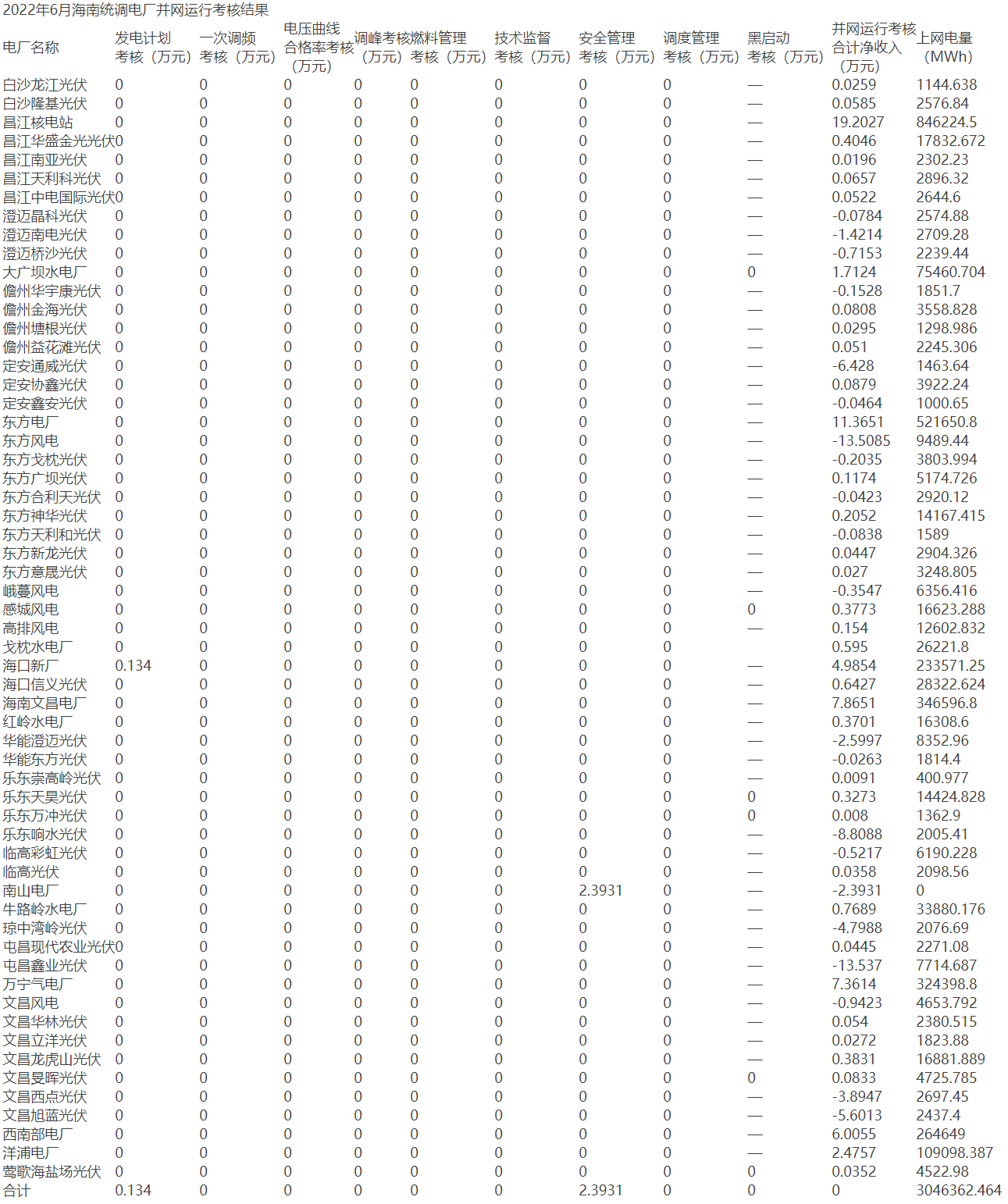2022年|海南統(tǒng)調(diào)電廠2022年6月并網(wǎng)運(yùn)行考核及輔助服務(wù)補(bǔ)償結(jié)果