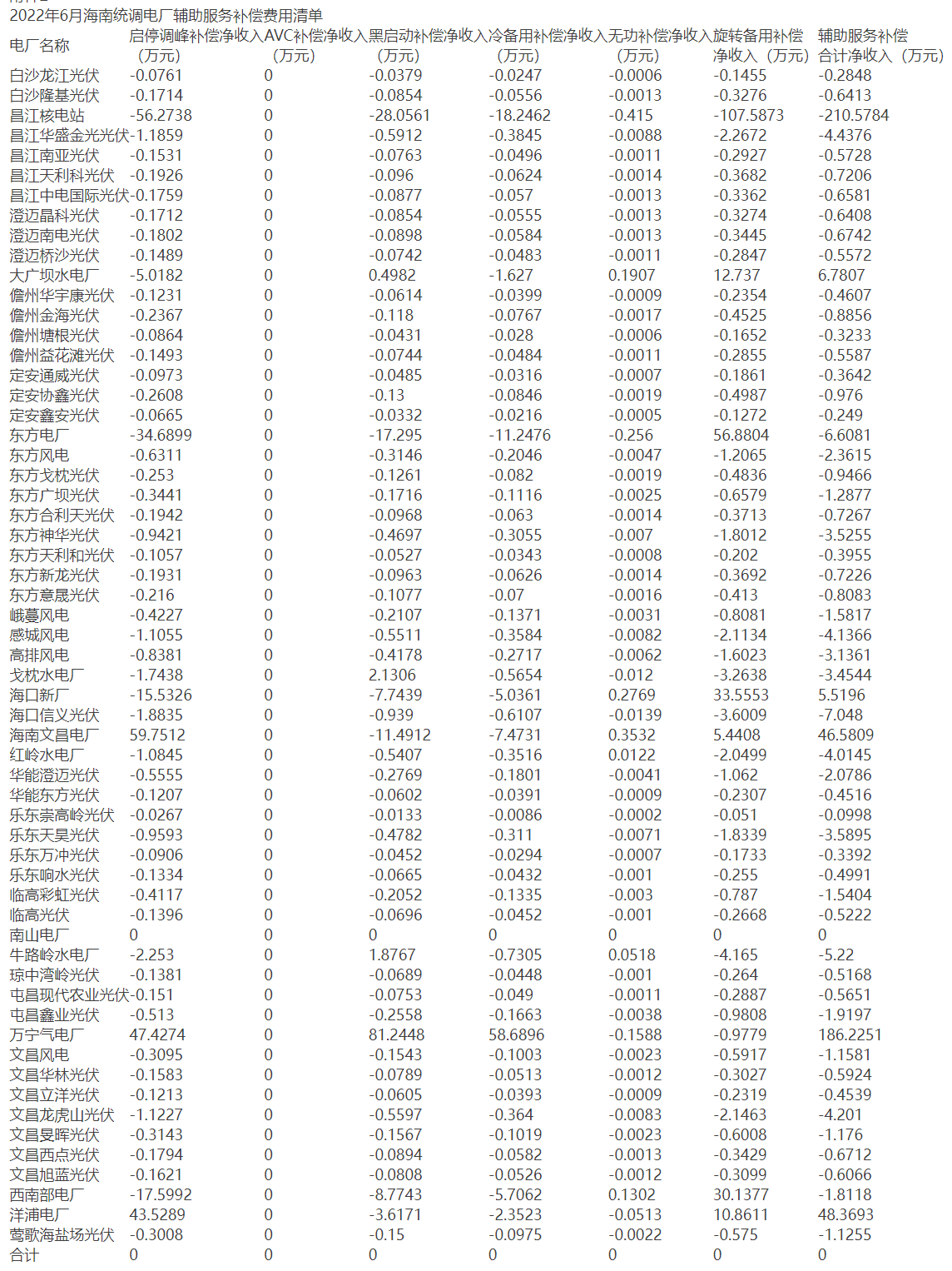2.2022年6月海南統(tǒng)調(diào)電廠輔助服務(wù)補(bǔ)償結(jié)果