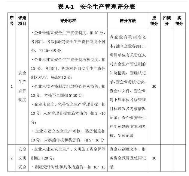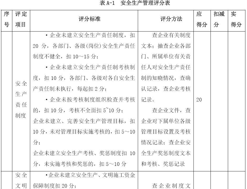 1 施工企業(yè)安全生產(chǎn)評(píng)價(jià)應(yīng)按評(píng)定項(xiàng)目、評(píng)分標(biāo)準(zhǔn)和評(píng)分方法進(jìn)行,并應(yīng)符合本標(biāo)準(zhǔn)附錄A的規(guī)定,滿分分值均應(yīng)為100分;